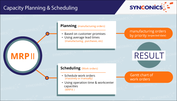 There are 2 aspects of MRP II – Planning & Scheduling. Newly introduced work orders scheduling based on capacity planning. Two step – System generates MOs for you and you schedule WOs.