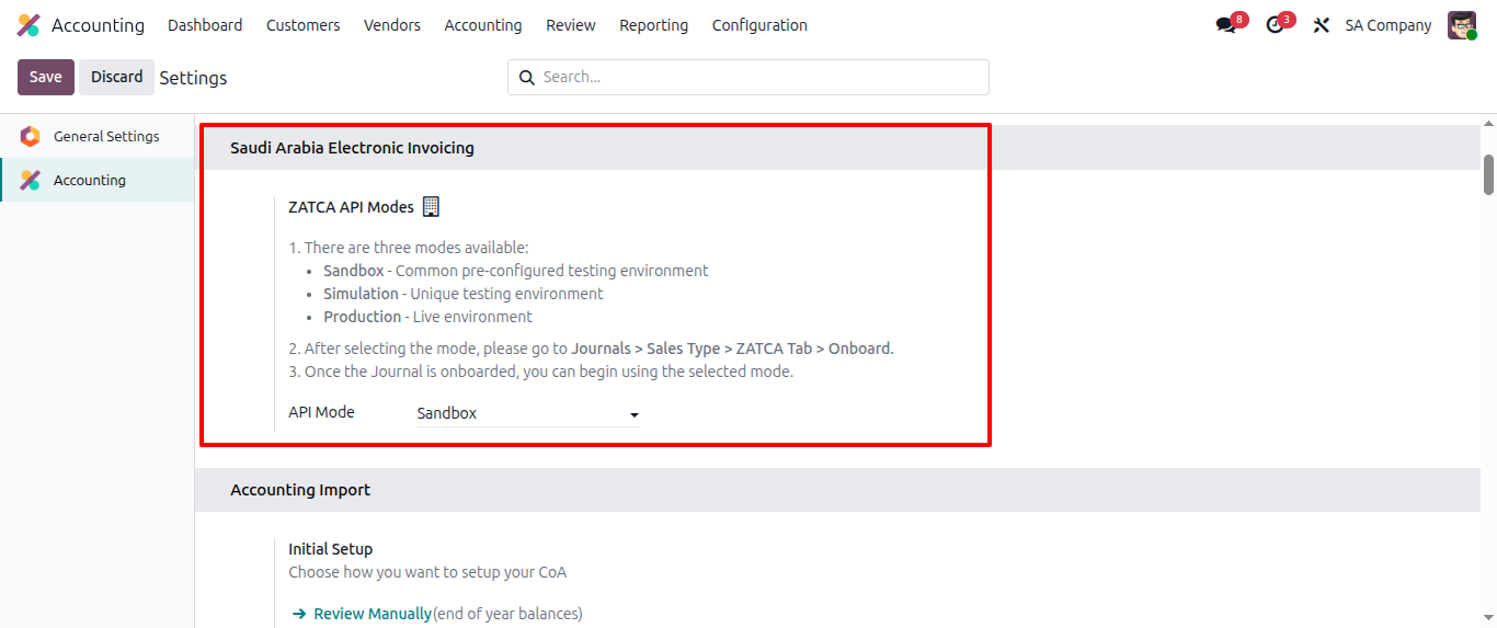 Step 2 - After installing the above applications, go to Accounting -> Settings, under the Saudi Arabia Electronic Invoicing section, you will find Zatca API Modes. Odoo supports 3 modes here