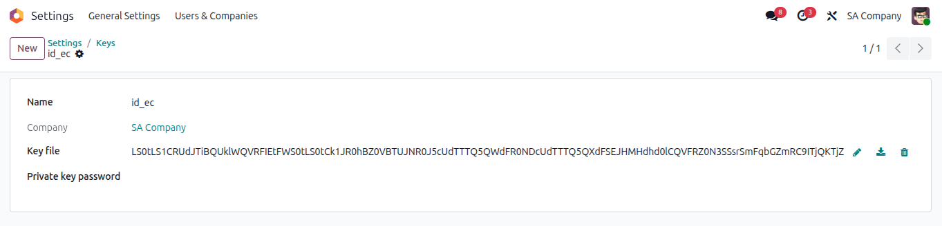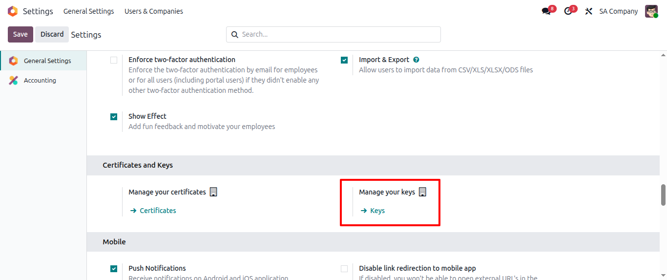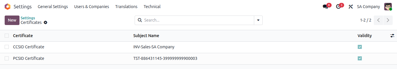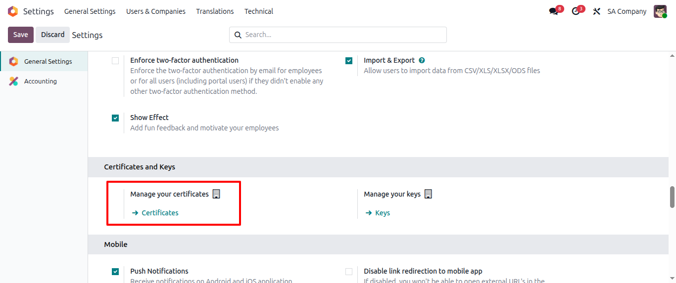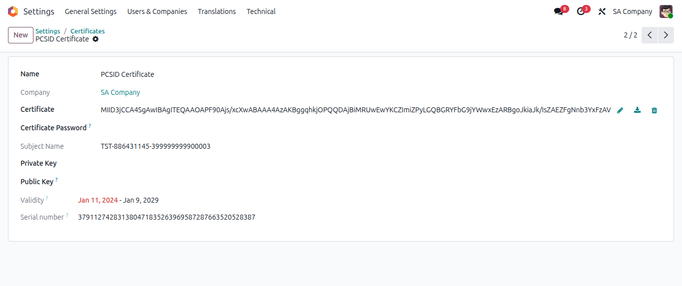 After the Accounting journal is onboarded, Odoo stores real time Certificate and key information