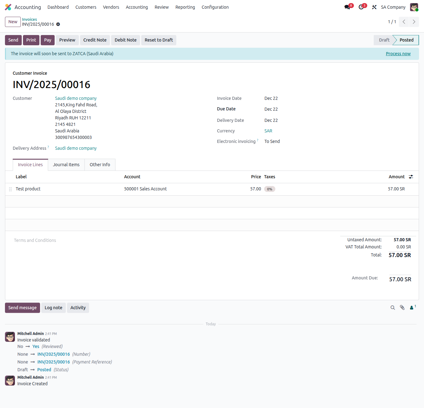 User will see here a notification that this invoice will be processed with Zatca, you can also click on the Process Now button