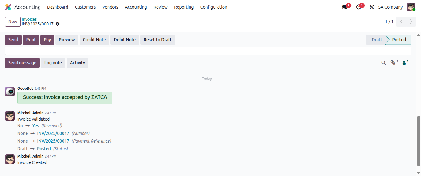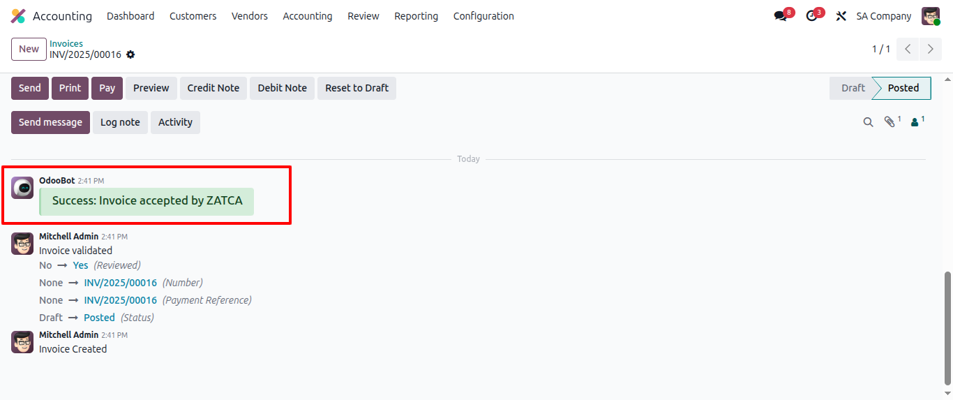 Step 3 - After an invoice is processed with the Zatca terminal successfully, the system will show you a success message in chatter of that relevant customer invoice.