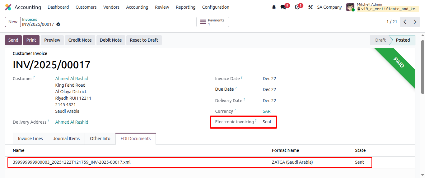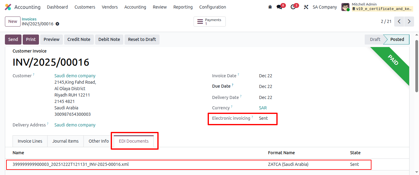 After a successful integration is done, the system will generate a UBL format XML file by going to the customer invoice - EDI documents tab