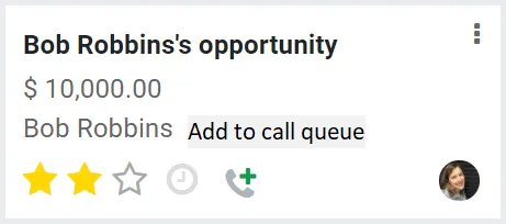 With one click from the kanban view in the CRM pipeline, you can schedule a call in your phone queue for yourself or for others. Simply hover on your contact's card and click to add to your list of next activities.